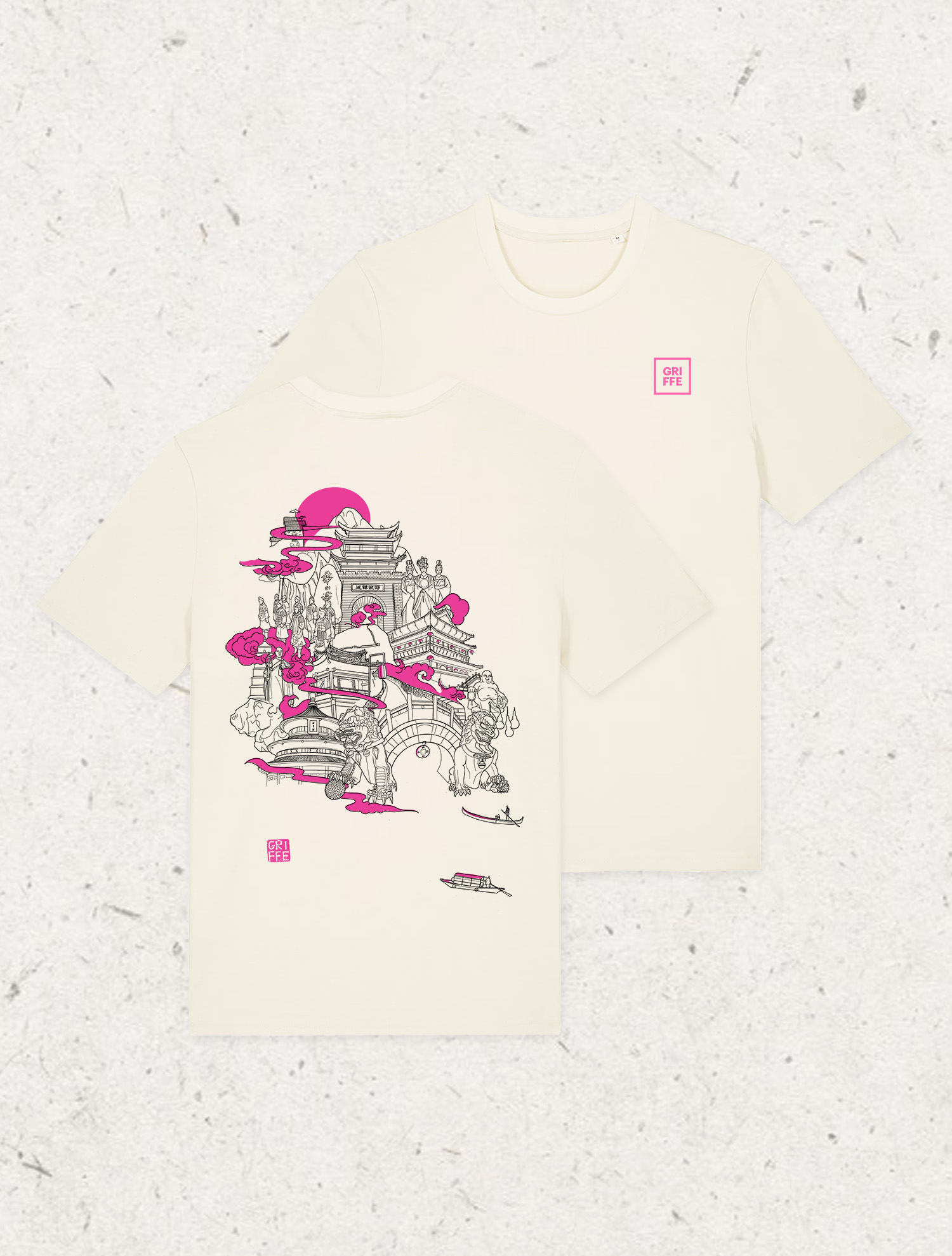 Suite à mon voyage en Chine en octobre dernier, j’ai cherché une manière de résumer ce séjour incroyable : l’ambiance, la culture, les coutumes et les paysages… Je me suis laissée emporter par la beauté du patrimoine chinois qui m’a inspiré ce dessin. Cette sérigraphie est réalisée en 2 couleurs, noir et rose fluo pour représenter les villes lumineuses de néon qui me fascine toujours autant.